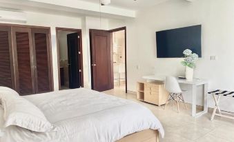 Living Area and Terrace: The open-concept living and dining area flows into a spacious private terrace, offering the perfect setting to unwind with a glass of wine or soak up the sun. The living room is tastefully decorated and features air conditioning and ceiling fans for a refreshing atmosphere. Guests can enjoy their favorite shows on the smart TV or connect to the high-speed Wi-Fi, perfect for working remotely or browsing seamlessly.