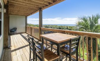 The oversized deck is a star feature of this condo, offering the perfect spot for enjoying the coastal breeze. You'll find comfortable lounge seating for four and a counter-height dining table with seating for four more. Whether you're relaxing or dining, you'll be treated to stunning views of the backyard outdoor oasis, complete with a garden, palm trees, protected maritime forest, and, of course, those breathtaking ocean vistas. The beautifully landscaped large back yard is perfect for lawn games with the family!