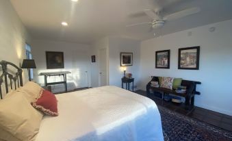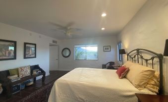 The Mountain View guest bedroom is located at one end of the house, offering complete privacy and a peaceful ambiance. High ceilings and large windows open to the serene desert landscape, making this ensuite room a perfect place for guests to unwind and enjoy the natural surroundings.