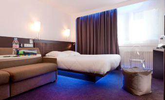 Depuis que nous bourlinguons c’est la plus mauvaise chambre que nous ayons eu au vue du tarif . Hormis la taille de la pièce , cette chambre est dépourvue d’âme : pas de café ni bouilloire , ni bouteille d’eau en chambre , pas de mini bar , sale odeur dans chambre , même pas de fauteuil ( un pouf !!!) vue sur rien du tout , hormis un morceau de piscine . Nous sommes très loin de lorient obligeant à reprendre la voiture. Route très passante (ce qui n’est indiquée nulle part) . Je pense qu’il serait bon de revoir les étoiles qui sont certainement données pour la présence de la piscine .
