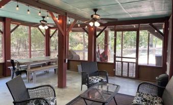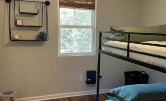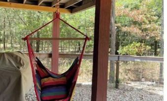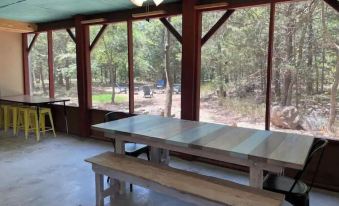 This delightful 2-bed, 2-bath cabin comes complete with a spacious screened porch, ample parking, and a cozy fire pit surrounded by Adirondack chairs. Nestled among tranquil trees for ultimate privacy, the primary bedroom features a queen bed, and the second boasts a full-over-full bunk bed. The well-equipped kitchen includes essentials like foil, cooking oil, ziplock bags, and spices. Enjoy the screened porch for games, ping pong, patio seating, and a dining table.