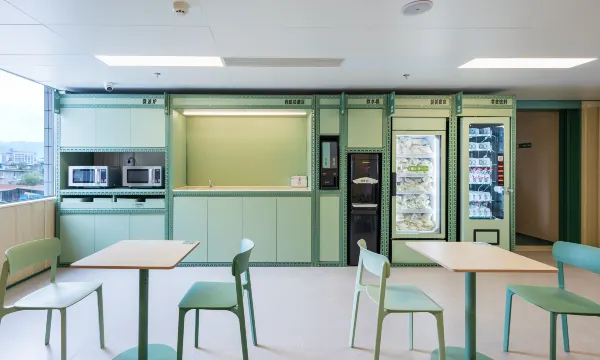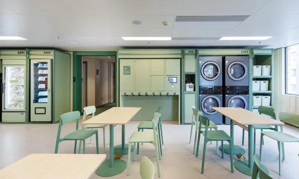 The self-check-in kiosk is on the first floor; guests can check in independently. The duty office and staff are also located on the first floor—please contact staff if assistance is needed. Guest rooms are located on floors 8, 9, 10, and 11. Floor 8 features a laundry area with washing machines and dryers, a self-service breakfast locker for pocket-sized meals, snack vending machines, luggage storage lockers, and other facilities.