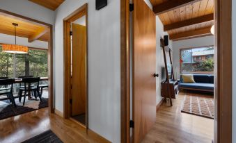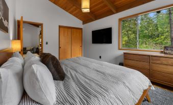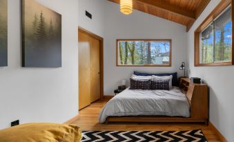 Discover the perfect riverside retreat in this stunning 3-bedroom, 2-bathroom mid-century modern home, nestled in the woods of Mt. Hood just outside Portland. Designed for both relaxation and adventure, this architectural gem blends clean lines and warm, natural elements with breathtaking river views. Floor-to-ceiling windows flood the open-concept living space with natural light, seamlessly connecting the indoors to the surrounding forest.