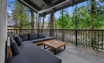The thoughtfully designed kitchen is perfect for gathering. For the coffee lover the retreat is equipped with multiple pour over brewing options, Ratio drip coffee maker & Fellow kettle. The cozy living area features a statement fireplace for chilly mountain evenings. The primary suite offers a peaceful escape with serene views, and two additional bedrooms provide space for family and guests. Step outside to a private deck overlooking the river, where you can unwind to the sound of flowing water, soak in the fresh mountain air and gather under a canopy of towering trees.