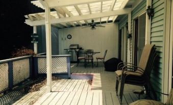 There is a big deck on ground level looking at the water. the deck/porch is covered and has a Weber gas grill.
