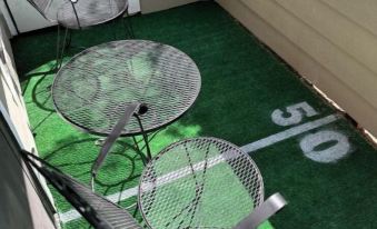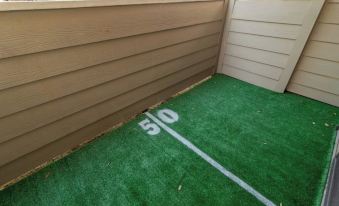 The 50 Yard Line has a separate bedroom with a king-sized bed, television, walk-in closet and a bath with a separate toilet and walk-in shower. The living area includes a queen sleeper sofa and big screen television. The fully-stocked kitchen has a refrigerator, stove, oven, microwave, dishwasher and coffee bar. With its own washer and dryer, guests do not have to leave the condo to do laundry. A small, attached patio provides plenty of light and accessibility to the outdoors. In addition, guests have full access to a large pool which has an attached dog park (you can swim while your dog plays) and lovely walking paths you can enjoy with your dog or human companion.