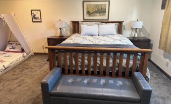 The home features 3 bedrooms with 1 king bed and 2 queen beds, perfect for a comfortable stay. One of the queen beds is adjustable.