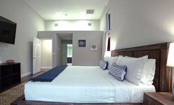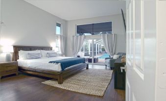 Master Bedroom - King size bed, en-suite modern bathroom with European rain shower and jetted spa, dual separated vanities, sitting area, 65" LED 4K UHD Smart Fire TV, and a walk-in-closet. Natural materials such as wood, sea-grass area rug, and a neutral color palette.