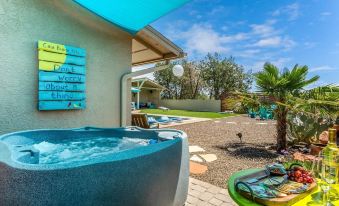 Serene, Tranquil, Luxury Accommodations. FANTASTIC VIEWS, 30' x 15' Private SWIMMING POOL, Private Hot Tub, SUPER Quiet! Just 20 minutes to Sedona, Historic Old Town Cottonwood, Jerome, & Clarkdale. Sparkling clean completely seperate and private guest studio on 2.5 acres in the Verde Valley! King size bed, fully equipped Kitchenette, and full private bathroom, Zen lounge with gym, shuffleboard, old school video games, football, darts, outdoor kitchen. Imaculately clean, crisp white linens & towels, Cotton Bath Robes, Large flat screen “smart TV” TV with fast Starlink internet access for Netflix, etc., Waterproof Bluetooth speaker to enjoy in your room or out by the pool, and WiFi. You will feel like you are on a tropical island getaway... but in the desert!