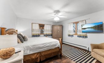 Winter at the lake is equally magical. Cozy up by the wood-burning fireplace or head outside for snowmobiling, cross-country skiing, ice fishing, and fat-tire biking. For quieter moments, enjoy movie nights on one of the three smart TVs or dive into puzzles and board games with your group.