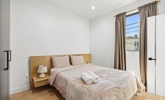 Second Bedroom – Queen bed, ensuite bathroom, blackout curtains, and soft linens