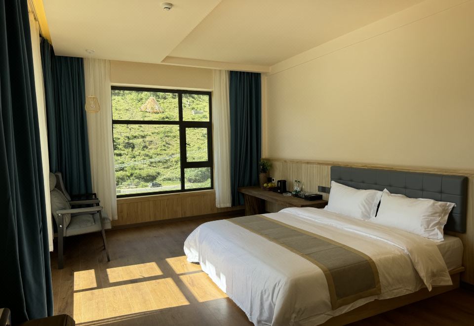 酒店環境幽美,窗外就是連綿的青山。老闆熱情好客,我們的車剛到,一家人就迎了出來,兩個妹妹迅速辦好入住房間,兩位長者主動幫助扛行理箱。進入房間,有種耳目一新的感覺,無論是落地的大窗,還是原木的家居設定,就連床前的地墊都顯示着主人的品位。愛了,愛了!