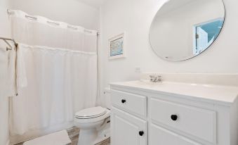 Across the hall awaits the third bedroom, outfitted with a comfortable queen bed and its own ensuite bathroom with a shower/tub combo, ensuring a restful stay for all guests.