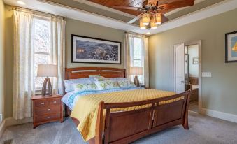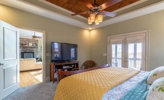Just off the great room, the beautiful master suite is truly a retreat of its own. With french doors that open onto the screened porch, the already spacious bedroom doubles in size by bringing the outdoors in. All bedrooms at StarGazer Lodge are king-sized and fitted with 400-thread count linens. The room also has a 46-inch LG Smart TV LCD TV with game console, DVD & streaming device. The master bath, yet another oasis unto itself, has an oversized garden tub and separate tiled shower with glass surround. Featuring twin vanities opposite each other, the master bath also boasts a huge window overlooking the mountainside. Beyond the bath, the master closet is almost its own room and has plenty of room for all your luggage to be tucked discretely out of view.