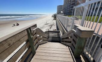 Direct Ocean Front on the No Drive Beach, South Daytona Beach Shores. 1 Mile South of Dunlawton Bridge. Close to restaurants and Pet Friendly Ponce Inlet. 1 dog under 20lbs allowed. Super Large Pool deck. Heated Pool. Ramp and Steps to the Beach. Exercise Room, Sauna. Second Level Sun Deck on the West side of the complex. Close to grocery stores and shopping malls. Very Nice area!! Great for kids, shuffleboard, basketball, pickleball and tennis courts.
