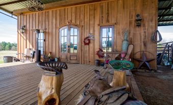Queen bed, two twin beds in loft, single hide-bed. Shower only, fully equipped kitchen, outdoor cooking and fire pit. Direct TV and NOW free WIFI for guests. Enjoy watching the deer , pet the goats, fish for bass, catfish or blue gill, golf cart avail for transportation. Do some local geocaching, Bigfoot sighting guaranteed .... Just 30 minutes from Shreveport, LA, Toledo Bend Lake or Carthage or Marshall Tx Explore the hidden secrets of NW Louisiana and East TexasAbout pets:No pets allowed.Sorry, I try to accommodate guests with allergies.About checkOut:Check out before 11:00 AM.About children:Children allowed: ages 0-17.Supervision needed for ladder climb to loft.About customRules:Smoking is allowed outdoors only. Please do not FRY food indoors, there are outdoor fryers available. No under 12 may operate the golf cart..Fishing is catch and release only except for keeping 3-5 fish to clean and cook onsight. No “cooler” fills..About checkIn:Check in after 3:00 PM.About smoking:Smoking is not permitted.Outdoor smoking allowed with “butt” can use.About minBookingAge:Minimum age to rent: 25.About events:No events allowed.