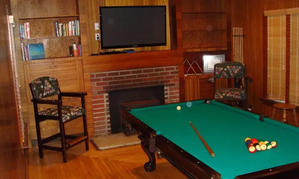 This two-story floor plan offers incredible options to make your stay enjoyable no matter what the season. The first floor offers an expansive kitchen-dining room layout. The kitchen is furnished with a bar-height counter and chairs so you have a wide, open view of the redwoods and river while you host friends and family. The dining area features plenty of seating (with a table for 12 and room for more) to host family gatherings. After dinner, enjoy the crackle of a Northwood’s fire in the living room, while curling up on one of several couches to enjoy an evening’s conversation. The first floor also has two of the most exciting attributes of the lodge: our redwood paneled sunroom which still has the original lead framed windows and our large mahogany paneled game room featuring a regulation pool table, fireplace and 50” flat screen TV, with plenty of games and reading materials to entertain the entire family.