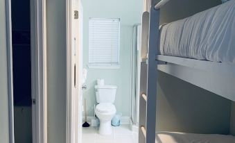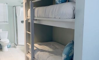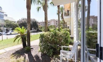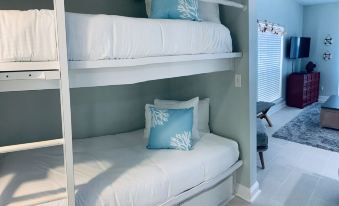 This adorable first-floor unit has a crisp, fresh, upgraded feel, vibrantly accented décor, and tasteful sea life artistic touches. Just a few steps away from the beach, you can enjoy the sea breeze from the balcony off of the living room. The living room is beautifully decorated with a good quality sleeper sofa, a large flat-screen TV, high-end Pergo style flooring, a teal occasional chair, and lovely distressed-looking shadow box coffee tables. The kitchen is fully equipped, and offers upgraded counters and full-size appliances. The dining table seats six and has a custom-painted shabby chic look. The primary bedroom has a nice queen bed, fabulous blue and white designer bedding, a flat-screen TV, and nicely done shabby chic furnishings. The twin bunk beds are built-in and offer crisp teal bedding, reading lamps, and fun fish accent pillows. There is one bathroom that has been nicely upgraded with a custom shower, upgraded lighting, and custom counters. This unit does not offer a tub, only a walk-in shower. There is also a centrally located, coin-operated laundry room for your convenience.About pets:No pets allowed.About checkOut:Check out before 10:00 AM.About children:Children allowed: ages 0-17.About checkIn:Check in after 4:00 PM.About smoking:Smoking is not permitted.About minBookingAge:Minimum age to rent: 25.About events:No events allowed.