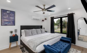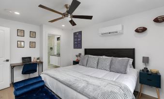 ↪ Master bedroom: King bed, workspace, en suite bathroom, and ceiling fan