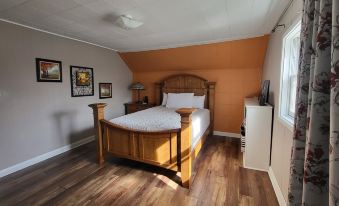 • Large master bedroom with queen bed, built-in shelving, and closet space