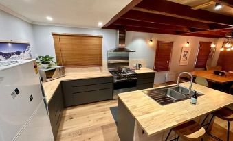 The entry foyer has a drying room and NEW laundry facilities. This leads through to the open plan living space with a LARGE modern kitchen, dining area TO SEAT 8 PEOPLE, and cosy lounge with plenty of seating around the BIG wood fire.