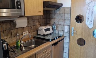 Gut zu wissen, dass in der Küche kein Herd und nur ein Kapselkaffeeautomat vorhanden sind.