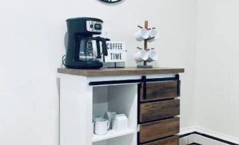 The full kitchen is complete with a traditional coffee maker. Coffee, and condiments are provided. The kitchen is stocked with cooking and dining essentials to prepare a meal for 8 or have food delivered from some of the delicious restaurants nearby.