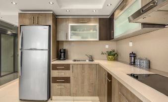 The kitchenette includes essential appliances such as a refrigerator, stove, oven, hot water kettle, and coffee maker, allowing for easy meal preparation. A dining table provides a comfortable space to enjoy meals together.