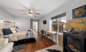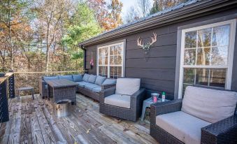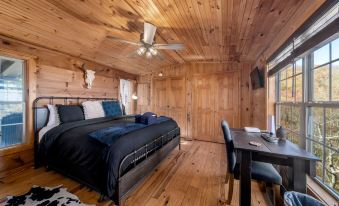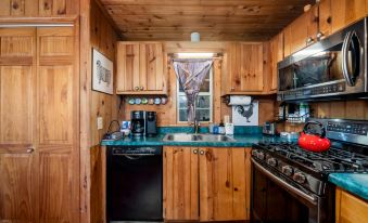 This quaint cabin includes two cozy bedrooms, providing space for a peaceful night's rest. Additionally, the guest house features a queen sleeper sofa, ensuring comfortable accommodation for all. The interior has cute furnishings and charming decor, creating an inviting atmosphere that exudes warmth and hospitality. Copper Kettle Cabin is perfect for pet lovers, welcoming furry friends to share in the experience.