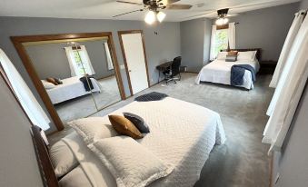 The lower-level master suite offers ultimate privacy and convenience, featuring a 65" TV, a king bed set, a cozy sleeper couch, and a coffee table set - perfect for couples wanting their children nearby.