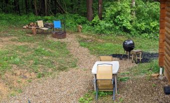 Take the paved driveway up to the secluded log cabin. Enjoy rocking chairs or the dining table on the front porch.