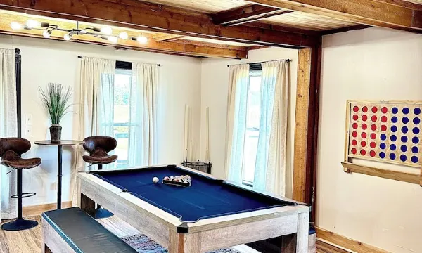 INDOOR LIVING: Smart TVs, fireplace, dining/pool table, board games, ample seating
