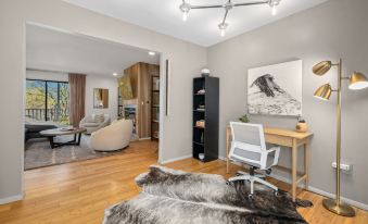 When you walk into home you will find our open concept living room, kitchen, and dining space that creates the perfect space for comfortable, memorable gatherings. The living room features a large Smart TV with all your favorite streaming channels, along with plush seating, large windows, a gas fireplace, a desk space, and a cocktail station! The kitchen is fully stocked with everything you’ll need to make a meal or just a good cup of coffee.
