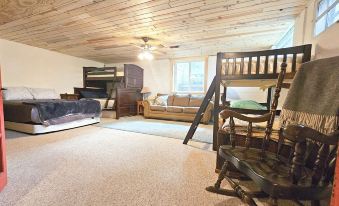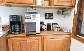 Additional pull-out couches in the living room. A fully stocked kitchen for easy meal preparation, a coffee bar, and a sandwich station.