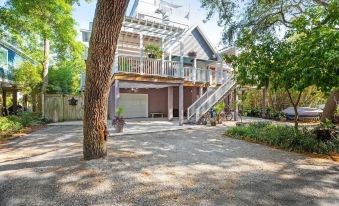 Extensively renovated in 2021, this piece of Folly history provides luxury southern lifestyle living & large group entertaining under a canopy of Oaks overlooking a private tropical oasis with a zero entry, heated/cooled pool (seasonally upon request), multiple decks, and 6 off street parking places. Treasured by many, this open & inviting 3000 sqft luxury home fit with 5 bedrooms + private loft (9 total beds), 3 full baths, 2 half baths + outdoor shower also enjoys an additional 1400 sqft space on the ground level that includes a gym overlooking a water fountain & a screened outdoor kitchen with sink + mini refrigerator. The outdoor space is perfect for entertaining equipped with custom mahogany table set for 10!