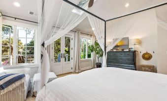 The first floor includes a light filled primary bedroom with king a bed that leads onto the expansive deck overlooking the pool, a queen guest room & ensuite bath along with a 3rd bedroom with queen bed flanked by antique Chinese doors.