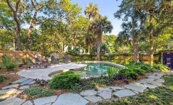 Our family group of nine, ranging from 7 to 84 years old, thoroughly enjoyed our stay. Everything we wanted was in walking distance: Five minutes to the beach, to the market, to tennis courts, or to numerous restaurant options. The kitchen was well stocked and easy to work in. Hosts were quick to answer any questions and offer many suggestions for activities. Of course the beach was the main attraction for the children, but we all especially enjoyed spending afternoons in the pool shaded by live oaks and surrounded by well tended flowers and shrubs that offered beauty as well as privacy. We would whole heartedly recommend a stay here.