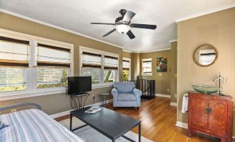 The back of this special home enjoys casement windows and French doors capturing all the outside beauty of the oaks while you enjoy the ocean breezes and sounds of the sur - vaulted ceilings and skylights amplify the natural beauty of the oak canopied property.
