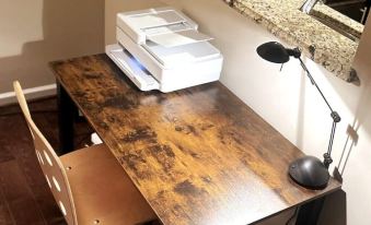 LIVING ROOM: Couch, Love seat, Accent Chair, Smart TV with streaming apps. Workspace with HP Envy Pro printer and ultra-fast high speed internet.