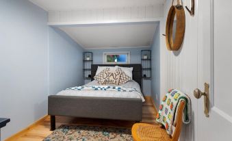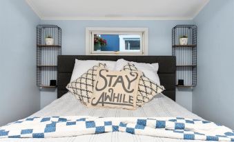 The Buddy Shack comfortably sleeps four adults. The main bedroom features a queen bed while the second bedroom has a new twin-over-full bunk bed. The wide open kitchen showcases beautifully-restored exposed beams and peak. It has everything you need to cook and entertain, including a 15.6 cubic-foot. fridge, new microwave, Keurig Duo, four-burner electric range with oven. The sitting room features a bay window with beautiful views of the lake, a cozy couch, a 32-inch TV and an air conditioner. The unique bar nook has a handmade bar, sitting chair and record player/Bluetooth speaker combo. An outdoor shed includes an apartment-size washer/dryer.
