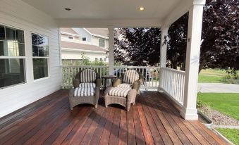 The Farmhouse is a 3,600 Sq Ft 5 bedroom, 5.5 bathroom two-story home. Open Floor Plan with Massive Tall Ceilings and Tons of Light! Views of the Bridger, Gallatin and Spanish Peaks Mountain Ranges. Recently constructed, but designed and built to resemble a turn-of the century farmhouse, complete with a bright red garage barn! The heart to this Modern Farmhouse is the kitchen and living area. The home is designed to entertain; the spacious and open kitchen has ample counter space to prepare food, serve and entertain. Sit at the large black granite counter and visit with the chef, or dine in the large circular dining area to spread out the fun. This large great room has a wall of Northern facing windows with views of the park like backyard and the Bridger Mountains. The fun continues from the kitchen and living room and spills onto the expansive covered deck that stretches the entire back of the house. More entertaining! The living room has plenty of seating, a cozy gas fireplace and a large smart television.