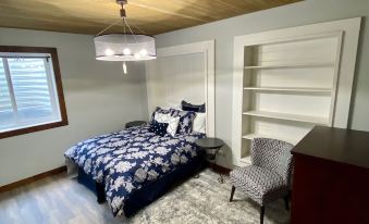The Farmhouse has 5 bedrooms; 3 Suites on the second floor and 2 large bedrooms in the downstairs that share a giant bathroom. The master bedroom has a Mr. AND Mrs. bathroom and a Mr. and Mrs. closet; The Mrs bathroom is designed with white, grey and marble and has a generous soaking tub. The Mr. bathroom is manly with steely grey tile, grey accents and a large shower. The master bedroom has a 15 foot vaulted ceiling, and a window seating area that feels like you are in the trees, as it looks out onto the tree-filled yard and views of the Bridger Mountain Range. The Blue Bedroom is so cozy and full of character; dramatic angles, huge vaulted ceiling with its own bathroom including full tub and shower and a quaint sleeping alcove for relaxing, reading, or sleeping. The third upstairs bedroom is cozy and its own television and is adjacent to its own bathroom. The upstairs is completed with an expansive laundry room with sorting table and ironing area.