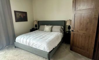 The primary suite is on the main level. It offers a comfortable king bed and a private bathroom with a walk-in shower and dual sinks.
