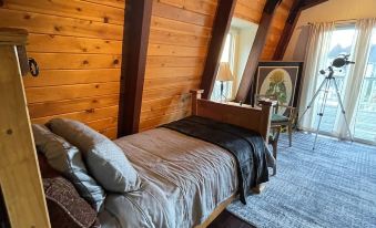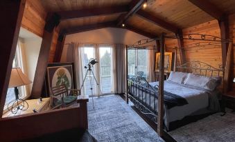 The upper deck is the perfect spot to set up the telescope and stargaze with an Irish coffee, while the lower deck offers a cozy, private place to unwind and take in nature. The cabin itself is comfortable and well-equipped, with a full kitchen, comfy beds, and plenty of blankets to keep you warm.