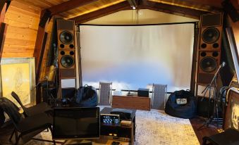 Nestled in the heart of Frazier Mountain at an elevation of 4890, Base Camp at Frazier Mountain is the perfect getaway for music lovers and audio enthusiasts. Anchoring its upstairs theatre is a Cinema Projector with 150" screen and two vintage Wholography Audio speaker stacks with 3,200 watts of amplification. With its wood burning stove and stunning mountain views, this cabin has everything you need for a relaxing and rejuvenating escape from the city.