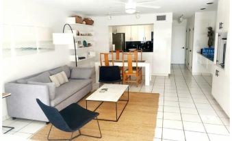 This unit has a master bedroom and bathroom with a king sized bed, television, and ample storage space so you can unpack, unwind, and feel at home. There are two murphy beds and pull out sofa in the living room for the rest of the family. The kitchen is fully equipped with modern appliances and all the essentials to prepare and enjoy a meal at home.