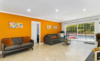 Guests sleeping in the master bedroom will enjoy the convenience of an ensuite bathroom. Another full bathroom is nestled by the other three upstairs bedrooms, while an additional full bathroom caters to the downstairs bedroom, living areas, and the backyard. All are fully stocked will fresh and clean towels to ensure you have a perfect, carefree stay.