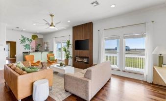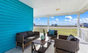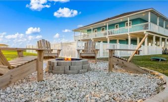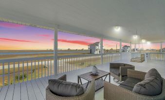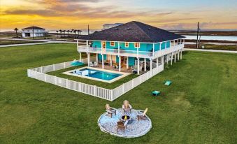Discover coastal luxury at 'The Palms,' a Modern Coastal-inspired 6-bedroom retreat on an entire acre along West Galveston Bay with amazing panaramic views. Accommodating up to 20 guests, indulge in the HEATED backyard swimming pool with a 120 sq. ft. tanning ledge, fire ring, and expansive game room and entertainment space. Enjoy stunning sunsets from our 360 Degree Upper Deck.