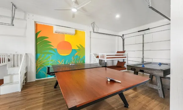 The main level provides four bedrooms, three of which boast en-suite full bathrooms, and a half bath in the hallway. The loft inside the upstairs serves as the fifth bedroom, and the ground-level floor serves as the sixth bedroom and game room, as well as an additional half bath, and consists of two twin size bunk beds, an air hockey table, ping pong table, and entertainment center. The game/bunk room also provides direct access to the swimming pool in the back yard.About pets:Pets allowed: dogs less than 50 lbs per pet (limit 2 pets total).About checkOut:Check out before 10:00 AM.About children:Children allowed: ages 0-17.About checkIn:Check in after 4:00 PM.About smoking:Smoking is not permitted.About minBookingAge:Minimum age to rent: 25.About events:No events allowed.