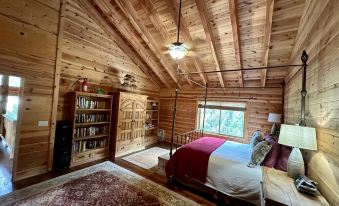 The common area has a gorgeous vaulted ceiling with windows floor to ceiling that showcase beautiful mountain views and a wood burning fireplace, a sprawling wood dining table, a loft office with an additional pull out couch, and full functioning kitchen with a view of the creek ready to use.
